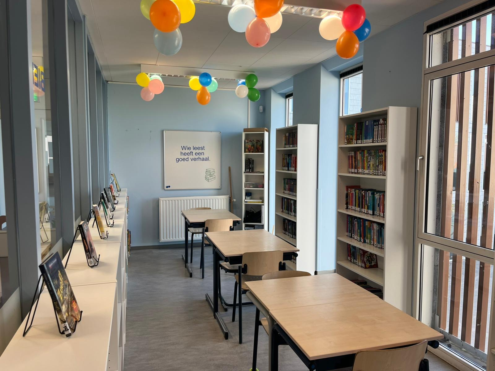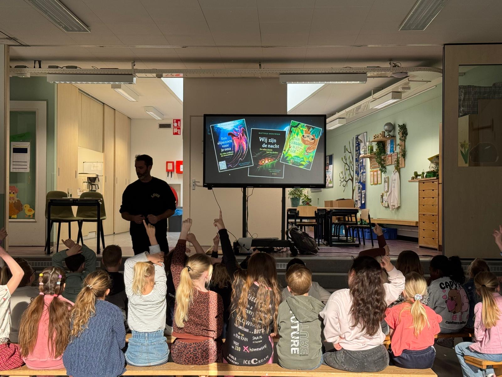Matthijs Meeuwsen kwam onze vernieuwde bibliotheek openen, signeerde zijn eigen boeken en de kinderen mochten hem per klas interviewen.