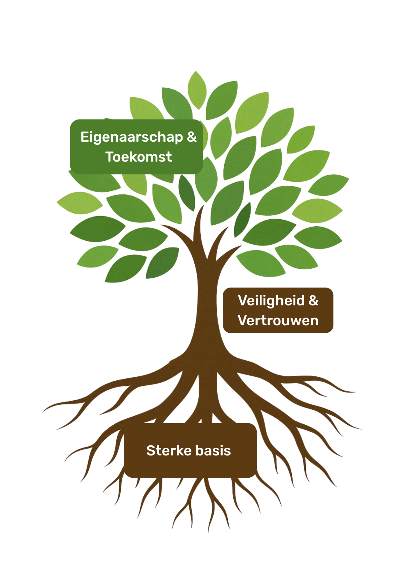 De stam symboliseert het veilige pedagogische klimaat waarin kinderen durven te experimenteren, fouten te maken en vragen te stellen. Met de Kanjertraining en een duidelijke pedagogische aanpak werken we aan: